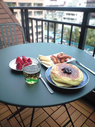休日に昼前後に起きて天気がまずまずだと、テラスで食事をする。この日は朝から大判のパンケーキ2枚がっつり。