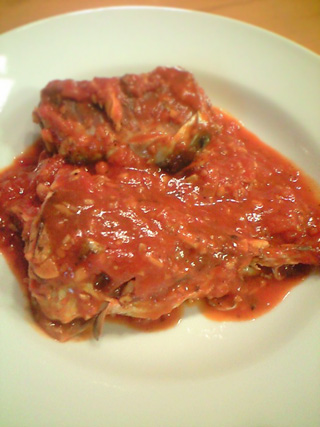 - サバを入れ、乾燥バジルとオレガノ・白ワイン1カップ弱を入れて、途中返しながら煮込む。サバを取り扱う時には、やさしく。(皮がはげたりしやすくてデリケートなので、トングなどを使用するとよい)ソースが程よい濃さになればできあがり。