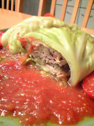 - キャベツ包みができあがったら、ソースを皿に敷いて、その上に乗せる。周りにジェノベーゼソース(市販のでOK)をバージンオリーブオイル少しでのばしたソースと、ミニトマトを飾りに配してできあがり。食べる時にはジェノベーゼソースとトマトソースを皿で合わせて食べる。