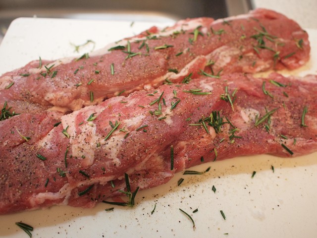 - 肉に下味をつける。塩こしょうを振って、ローズマリーをちらし、手でなじませて置いておく。