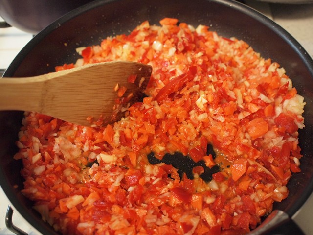 - 玉ねぎ、にんにく、にんじんをオリーブオイルで炒める。割とじっくり。炒めはじめに塩こしょうを少し入れる。炒めはじめる時の塩は野菜の甘味を引き出すのに大事。