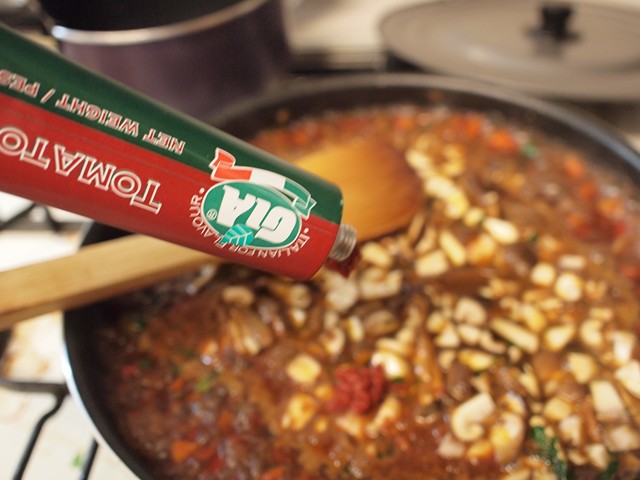 トマトペースト投入。こういうチューブで売ってる。普通のトマトの水煮より濃い。(約2倍ほど) - 煮詰まってきたところで、コクと風味のためにマスカルポーネを入れる。
