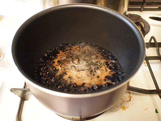 これを煮詰める。 こんな感じ。 - この肉はダブルソースで食べる。一つは↑の煮詰めたたまねぎソース、もう1つは煮詰めたバルサミコ酢。バルサミコ酢を1カップ弱、鍋(酸で腐食しないホーローかフッ素加工のもの)に入れて、半分くらいになるまで煮詰める。