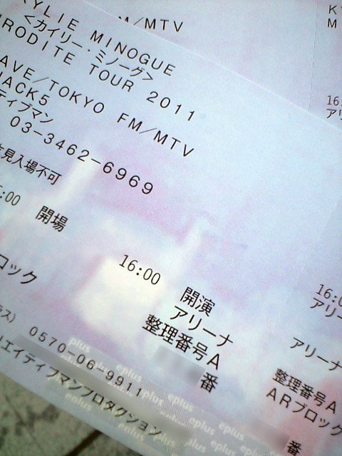 さて、期待を込めて行ってきたカイリー・ミノーグのライブ。他の国では”Les Folies Tour”と題されているが、日本ではよりとおりのいい、Aphrodite Tourの名前がついている。昨日は雨。風も強く、傘が裏返ったり飛ばされたりするほどだったが、めげずに向かう。kylie.comの先行発売で買った我々(今回はじょにおと行った)、ついて当日券売り場でチケットを引き換えて入場整理の列に並ぶ。海外先行発売の方がいい席だったようだ。アリーナに入る人達のうち、さらに整理番号Aというので、並んで待つ。