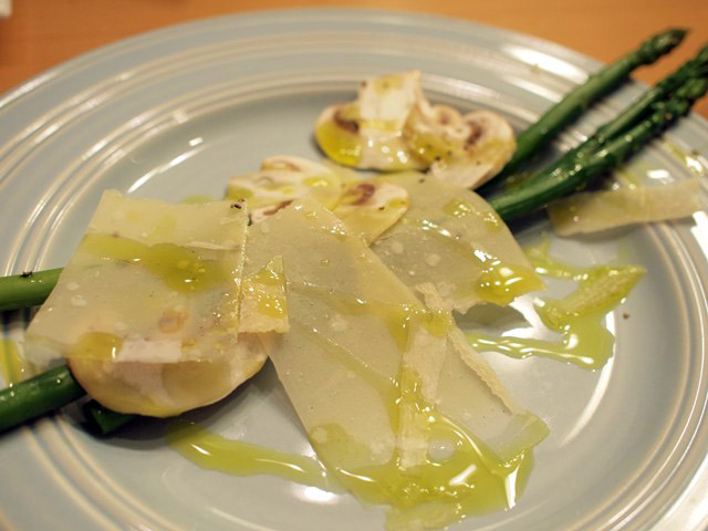 このサラダはドレッシングを作らない分、簡単。水気を切った茹でアスパラガスを並べ、その上にスライスしたマッシュルームを並べたら、塩こしょう。そしてオリーブオイルをふり、その上からスライス(というより削った)パルミジャーノ・レッジャーノを並べて出来上がり。簡単にできておしゃれ。 食べる時には取り分けて、好みでオリーブオイルを追加。