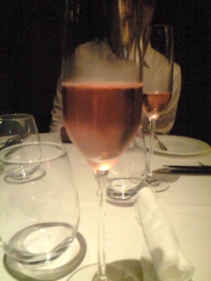 今回飲んだのはTaittinger Cuvee Prestige Rosé(テタンジェ・キュヴェ・プレステージ・ロゼ)。1734年創業と歴史があり、ジェームズ・ボンド愛飲の(という設定になっている 他にはボランジェも。というかボランジェの方がそのエピソードでは有名か)シャンパーニュ。ロゼのシャンパーニュの製法は、白ワインと赤ワインをブレンドする方法と、黒ぶどうの果皮を浸けて色を出すマセラシオンという方法(手間がかかり、品質が安定しにくいのであまり採用されない)があるらしいが、このロゼは前者の方法で作られながら、その混ぜあわせる赤ワインの色付けにはマセラシオンを用いるという、いわば折衷法を採っているようだ。