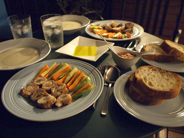 涼しい日が続いていたが、そういう日にはテラスでの食事が気持ちいい。ということである日の夕食風景。この日のメニューは、冷製チキンロール(中に巻いたのはセロリとネギ)、蒸し野菜、ヴィシソワーズ、バゲット。チキンロールは、ライムジュースとおろししょうがとミョウガのソースを作って、それで食べた。サッパリしてておいしい。写真中央に黄緑色に見えるのは、Masía El Altetというところのエクストラバージンオリーブオイル。香りたかくて、パンにつけて食べると美味。