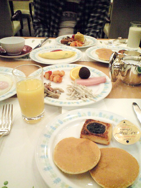 朝食はホテルのビュッフェだった。こちらはさすがにオークラの面目躍如。サービスは迅速丁寧、玉子は好みの方法でその場でオーダーして調理してくれる。