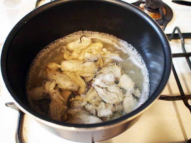 - 牡蠣の下茹でをする。牡蠣は縮みやすいので、身のおいしさを活かし、かつ出てくるエキスも活かすために白ワインで茹でて、その茹でた白ワインをソースを煮詰める時に使う。白ワインを鍋に入れて沸騰したら牡蠣を入れて、30秒ほど(牡蠣のひだが開いてほどよく火が通るくらいに)茹でる。アクが出るのですくって取り除き、牡蠣はざるに取り、茹でた白ワインは取りおく。