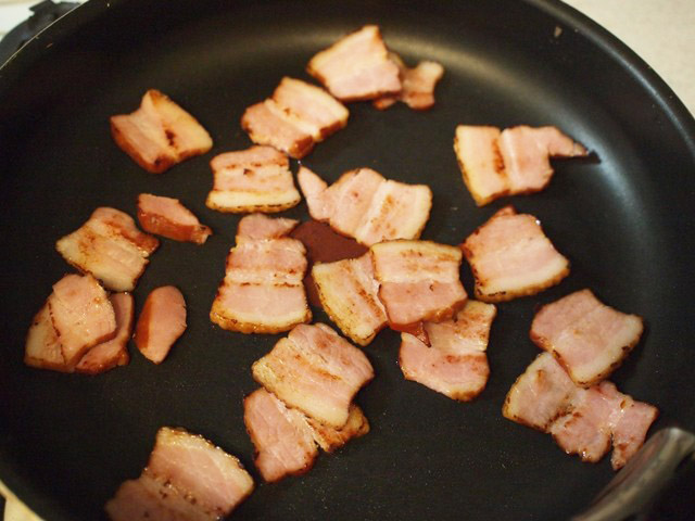 - ベーコンはブロックなら2、3mmの厚みに切る。薄切りなら3cm幅。
