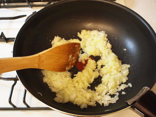 じっくり。 - オリーブオイルを鍋に敷き、熱してから刻んだ玉ねぎとにんにくを入れる。今回は煮込んでしまうので、にんにくを最初に熱する必要はなし、一緒でOK。玉ねぎのおいしさを引き出すために、塩をほんの少し振って、透明感が出てまとまりかけるくらいまで炒める。