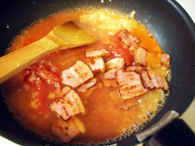 まとめて茹でておいて残りは和食に転用してもいい。 - ソースが煮詰まってくる頃、パスタを茹でる。ソースが煮詰まったら、パスタの茹で汁をソースに加えてゆるさを調節しつつ、乳化させ、味を見て塩こしょうで整える。