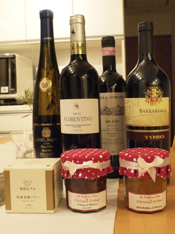テレビを見た翌日、新宿に買い物に出かけて伊勢丹の地下でワインを買い込んだ。普段使い用なのだが、バルバレスコとキャンティ・クラシコを1本ずつ。それに加えてやや甘めのドイツの白ワインとスペイン産のフルボディーのワインをじょにおの希望で書い、じょにおがまとめて会計するというので、それまでワインコーナーの向かいを見ていると、フェルベールのコンフィチュールがあるではないか。味見ができて、なかなか良かったので、2つ買い。そして最近はバターが入手難のようなので、帝国ホテルブランド(でも四つ葉が生産)の発酵バターも買う。