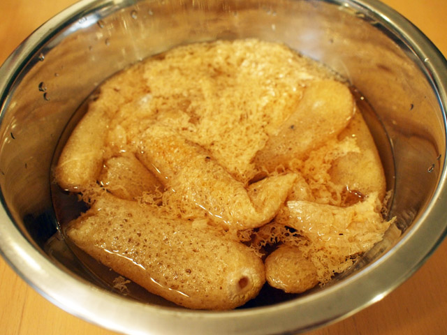 アミガサタケが戻ったら、ざるで汁と分けて、アミガサタケ自体はやさしく絞っておく。戻し汁を鍋に入れて熱し、煮立ったら鶏がらスープの素を入れて溶く。これが煮込みのスープになる。量が少なければ水を入れて調節。においがするので、しょうがをすりおろして汁のみ加える。