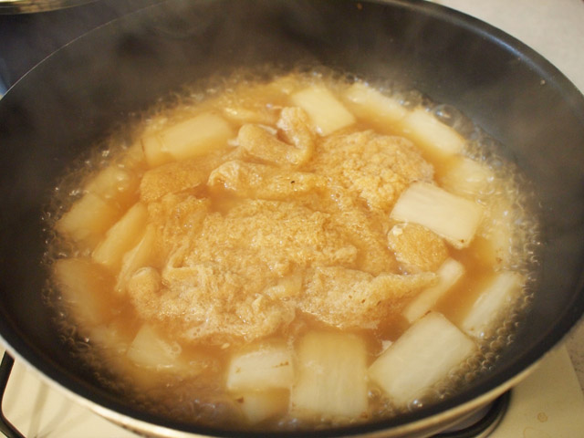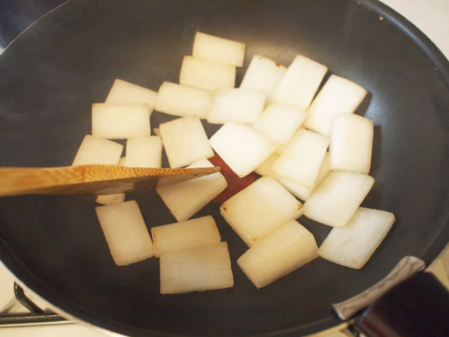 大根を炒める。鍋に油を入れて熱し、大根を入れて、端にやや焦げ目がついて透明感が出るくらいまで炒める。