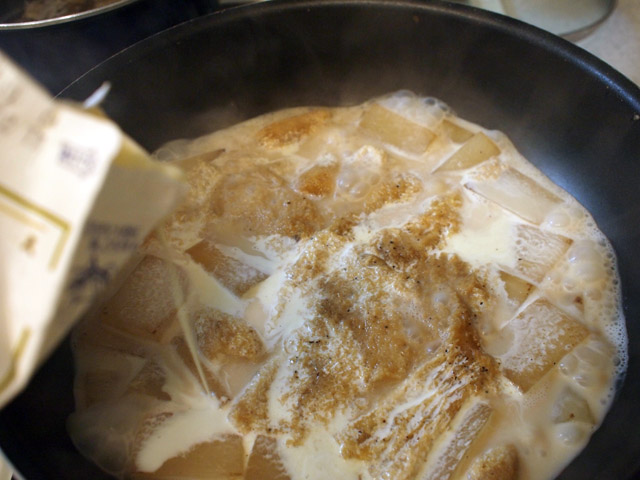 良い感じの濃度になって大根がさらに最初より透明になり、大根にスープが入った色になったら、塩コショウで調味。(きのこのおいしさがあるので浅めでOK)そして生クリームを入れて、さらになじませるように少し煮る。