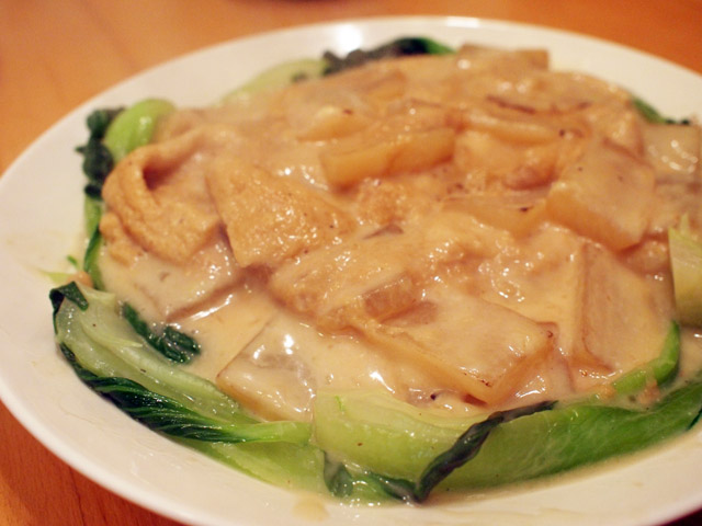 煮上がったら水溶き片栗粉を入れてかき混ぜ、煮立たせてとろみを調節して、煮込みは完成。チンゲン菜を縦6つ割にして、ごま油ほんの少しを加えたお湯で茹でてお湯を切り、茹でたチンゲン菜をアミガサタケと大根が煮上がったところに入れて、少し和えてから皿に盛り付ければ……