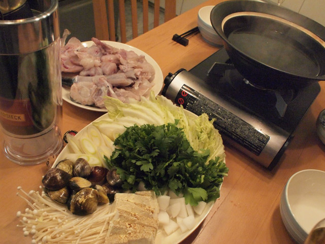 さっそくさばくことにする(注:もちろんふぐは危険部位を取り除いて、身と皮だけになっているもの=「磨き」というらしい を、食べられる状態にする、という意味)。しかし、ふぐに包丁を入れた経験はない。まあいいや、何とかなるでしょう。背骨の横についている身に包丁を入れ、サクを取って、引き包丁でなるべく薄くスライスしては、一枚ずつ皿に並べていく。骨は頑丈だが、なんとかブツ切りも鍋用に作る。皮はもちろん湯引きで食べるつもりだが、そのままだとグニグニしている感じなので、さっと湯がいて氷水に取り、切りやすくなったものを切って盛って、何とか準備はOKに。