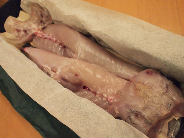 昨日、暮れも押し迫って、買い物に出かけていた車の中で、晩ご飯を何にするか話していたら、じょにおが仕事関係の人からふぐが届いたよ、と言う。じゃあふぐ刺しにふぐ鍋かな、などと話していた。俺の頭の中の予想としては、スーパーであるような、円形に盛られたふぐ刺しパックと、ふぐちり用のブツ切りが上品な量で届く感じ。その予想のもと、とりあえずはゆずその他の薬味と鍋の具を買ってきた。ところが……