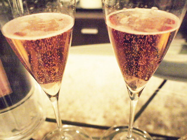 帰宅して、夜は3周年の乾杯。年末に買ったストックから、「我々のバラ色の日々を祝して(笑)」と、Deutz Roseを選択。