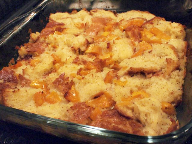 耐熱皿にパンを敷いて、バニラビーンズをブランデーで溶いて(バニラの香りはアルコールに一番溶ける)、プリン液に混ぜ、それをパンにかけて軽く混ぜ、厚さがなるべく均一になるように均し、ドライマンゴーを散らしてしばらく置く。(7、8分くらい)パンが完全にやわらかくなって液と馴染んだら、180℃に余熱したオーブンで10分、焼き色がついてからアルミ箔をかぶせて更に8分。