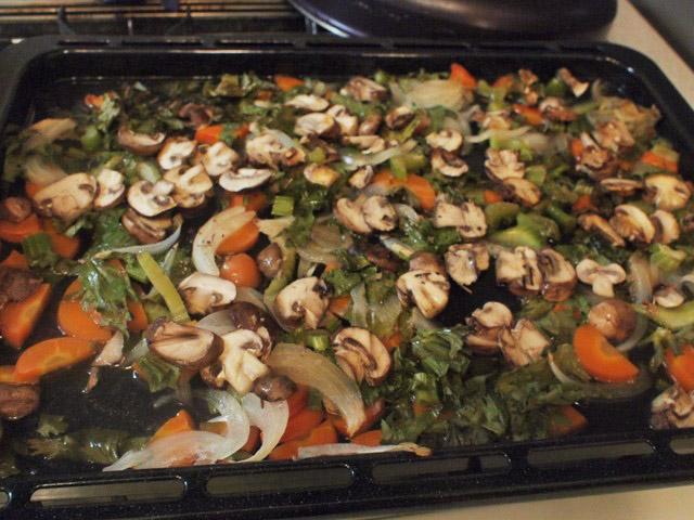 切った香味野菜を、薄くオリーブオイルをひいたオーブンの天板に均等に敷く。この上に牛肉を置くのだが、直接置かずに足のある焼き網などを置いて野菜を下敷きにした上で肉を置いた方が、野菜が焦げたりしないのでいい。(野菜は後でグレイビーソースに使う)