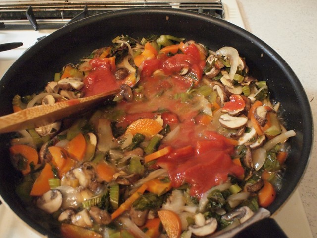 オーブンから出した香味野菜、トマトペースト、タイムを加えて少し炒める。炒めるのはオリーブオイルがお勧め。