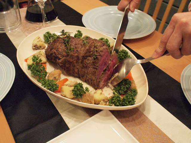 オーブンから出したら肉をアルミ箔でくるんで、しばらく(少なくとも1時間くらい)は室温に置く。これで熱が均等にまわり、肉汁が落ち着く。したたった肉汁はグレイビーソースに使うので捨てない!