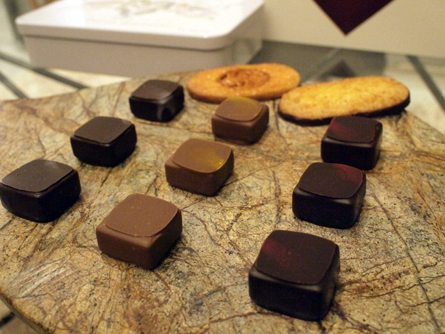 さて、開けてみると、ボンボンショコラと焼き菓子の組み合わせが現れる。手元に参照するべきリーフレットなどもなく、味をさっそく。