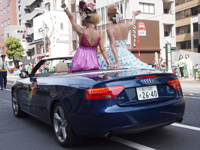 会場は幸い晴れてパレード日和。晴れるのはいいが、もうこの時期になると暑いので、あべおの活躍を少し見たあとはベーカリーカフェに行って軽くランチにして、パレード出発の整列まで待った。整列の時にはちょっと運営の要領が悪かった感じ。フロートの受付で、フロード別に色分けしたリボンを参加者に配るのだが、そのリボンと受付で掲げているボードの色が違う。そして、そのボードを持つ担当者が、「ここは○○のフロートです」と案内すればいいのに、ボサッと立っているだけで、ちょっとアレな感じ。まあ、しょうがない、初回とはそんなもんなのかもしれない。