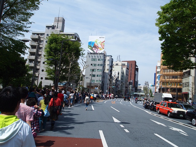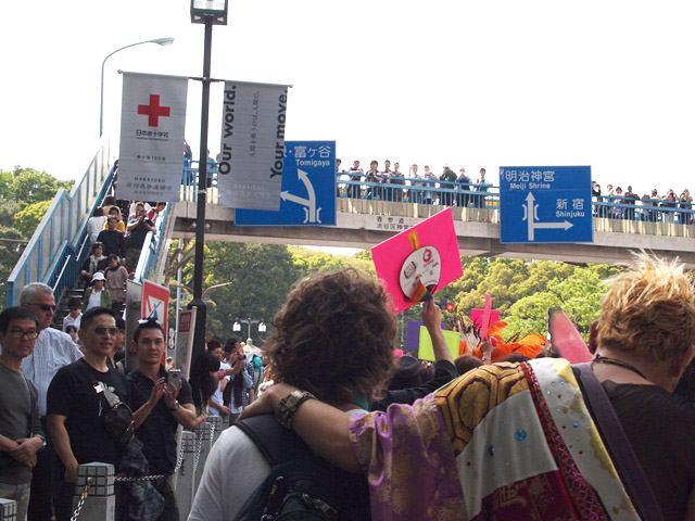 会場は代々木公園イベント広場。午後1時15分に出発し、そこを出て、公園通りを渋谷に下り、明治通りに出て北上、原宿へ坂を登って帰る、というコース。会場とコースは例年通りだが、開始時間が違った。