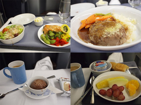 搭乗し、しばらくして機内食がサーブされたのだが、さすが機内食がまずいとの定評のユナイテッド、その伝統は揺るがず、オードブルもメインも、正常な味覚を持った人間が食べるべきシロモノではなかったので、ほとんど残した。何気なく周りの様子をうかがうと、周辺の客も皆残していた模様。食後のアイスクリームが一番マシだった。
