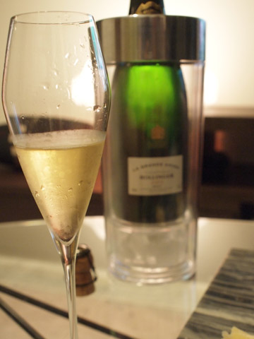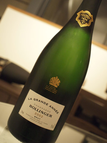 Bollinger La Grande Année 2002(ボランジェ ラ・グランダネ2002)。ラ・グランダネを飲むのは2000を2月に飲んで以来半年ぶり。2000との違いは、もちろん収穫年が違うのだが、最も大きな違いはセパージュ(ぶどう品種の比率)。2000はピノ・ノワール63%、シャルドネ37%なのに対し、2002はピノ・ノワール60%、シャルドネ40%と、ピノ・ノワールの比率がわずかだが下がっている。ボランジェというとアイ村のピノ・ノワールのふくよかさを期待するところだが、どうなのだろうかと早速開栓。