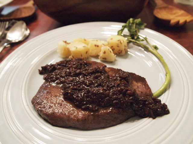 黒毛和牛霜降り肉ステーキのポルチーニ茸と赤ワイン・バルサミコビネガーソース。うちでの料理なので、肉は大判、ソースも過ぎるくらいにたっぷりかけてダイナミックに食べる。