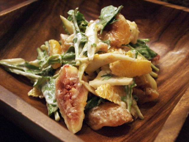 サラダはフルーツサラダにした。皮を剥いたいちじく、生プルーン、実を取り出したオレンジ、セロリ、ルッコラを、水切りしたヨーグルトと白ワインビネガー、エクストラヴァージンオリーブオイル、塩こしょうを混ぜて、マヨネーズ風だがヨーグルト風味の爽やかなドレッシングであえる。