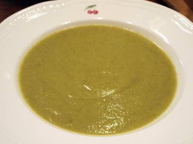 スープは濃厚な緑の野菜を味わう物を作った。下茹でして粗くみじんにしたブロッコリー、クレソンをブイヨンで煮て、粗熱を取ってブレンダーでつぶし、裏ごししてからアボカドを入れてさらになめらかになるまでマッシュ。もう一度裏ごしして火にかけ、塩と白こしょうで味を整える。