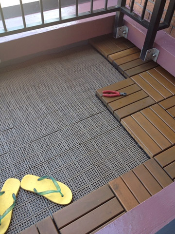 長らくかかっていたマンションの修繕工事もほとんど終わり、建物を取り囲んでいた足場もやっと撤去されて、突然テラスに人がいるということがなくなった。そこでやっとダイニング前のテラス部分にデッキボードを復旧させる。