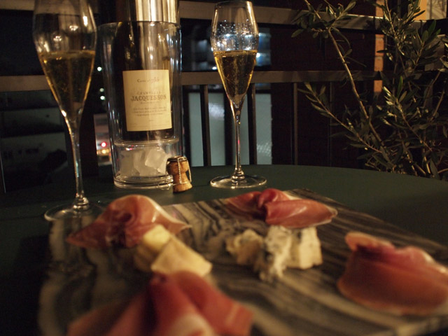 あらためて色合いを見ると、密度のあるゴールド。泡は軽やか。この日は写真のとおりテラスで食事をしたのだが、液体のきらめきがひときわ気分をよくしてくれる。