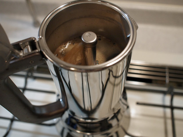 これ、水を入れる下の箇所と、上のコーヒーが上がる箇所の取り付けが結構頑丈。最初戸惑ったのだが、外れて、各所を洗ってからさっそく試す。最初なので、マニュアルに書かれた細々した注意事項を忠実に守りつつ火にかける。当たり前ながら、無事抽出。