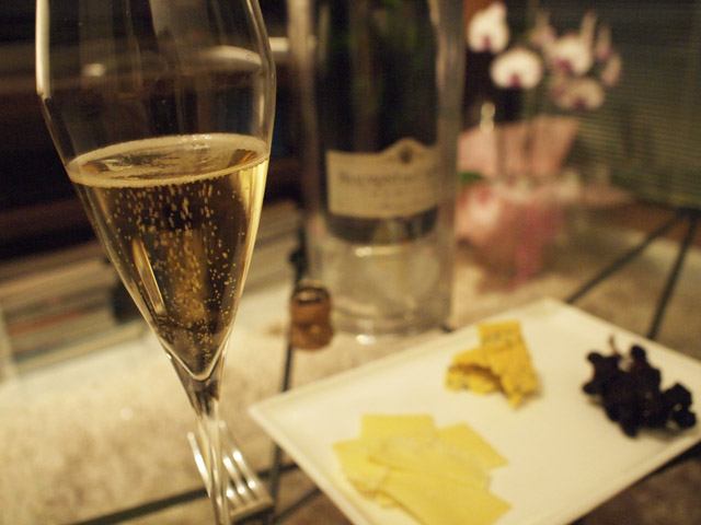 食事を終えて、チーズや枝付き干しぶどうと共に飲んでも、品の良い味わいが、やすらぎと華やぎを同時に与えてくれる。雑味の無さは、さすがクール・ド・キュヴェ使用の面目躍如か。飲み始めのいわゆるアタックも控えめだったので、人によっては優しすぎて「パンチが足りない」と感じられるかもしれないが、これはこれでありだと思う。