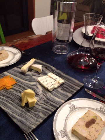 まずは夕方に軽くチーズ、テリーヌとワインでスタート。ワインはシャンボール・ミュジニーのそこそこの物。そこそこではあるけれども、エレガントで破綻がなく、穏やかな年越しにぴったりの味。食べ物は、チーズを4種と、フォアグラといちじくのテリーヌ。これを食べたら夕寝をして、それから次の食事にしようという寸法。