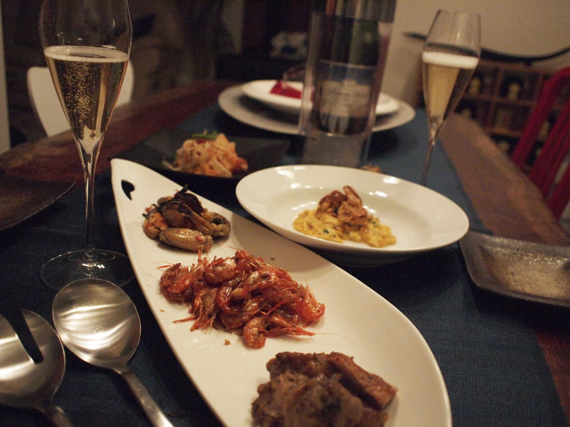 さて、帰ってきての大晦日の夕食は、3段階に分けて。年越し蕎麦は食べねばならないし、何かちょっとした惣菜も食べたいし、ワインとシャンパーニュも欲しい、という贅沢のために。
