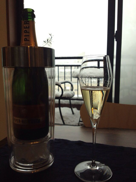 そして見る間にますます降り積もってゆく雪を見ていて、ここは風流に雪見酒だ、と思いつく。俺の場合は雪見酒の酒はもちろんシャンパーニュだが、仕事に出ていたじょにおと昼休みに電話し、ちゃんと許可をもらって。(笑)