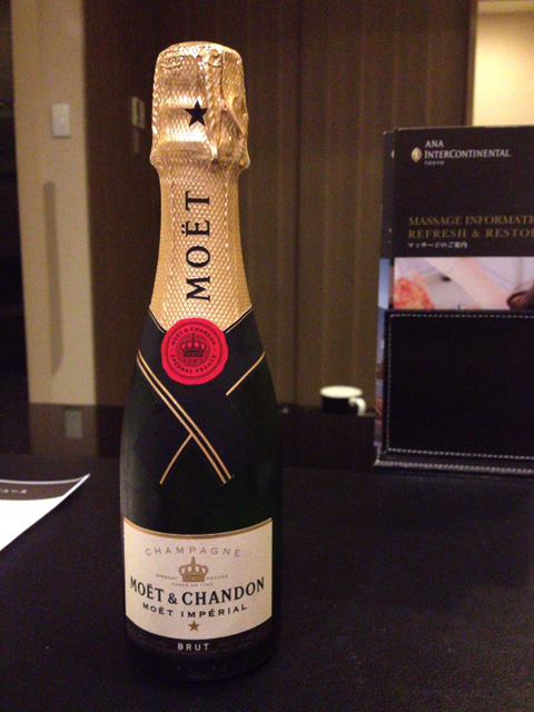 この時点で深夜1時過ぎ。じょにおは即寝。俺はもう少し起きていることにして、寝室とのパーティションを閉じてピッコロサイズのシャンパンを。シャンパンバーのはしごを諦めたくせに。(笑)