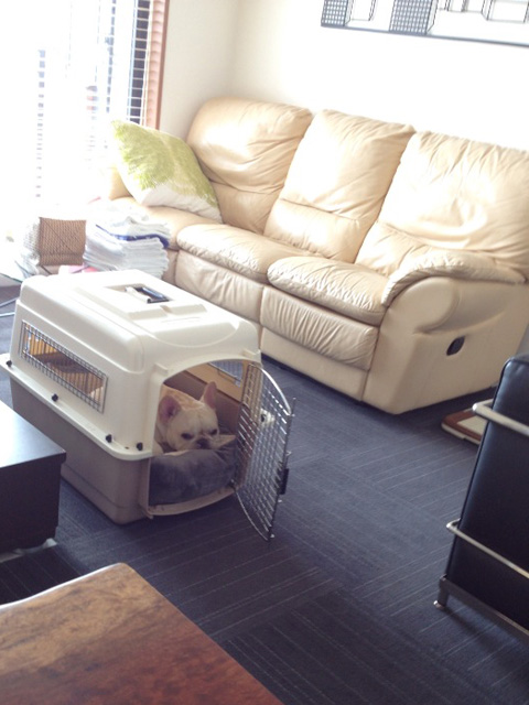 ケージを部屋に置いていた時代は、夜はもちろんケージで寝かせていたが、今は車での移動にも使うクレートで寝かせている。訓練時に「クレートに慣らしておくと楽ですよ」と言われて、クレートに入れると褒めたりしていたところ、本犬クレートが好きになり、自主的に入る。数時間留守にする時にはクレートに入れて扉を閉めて出かけていたが、今では特に扉を閉めておかなくても、1頭でいる時にはクレートで寝ているようだ。帰ってくると、クレートから眠そうにして出てくる。部屋の物は何一ついじられていない。本当にいい子になったものだ。