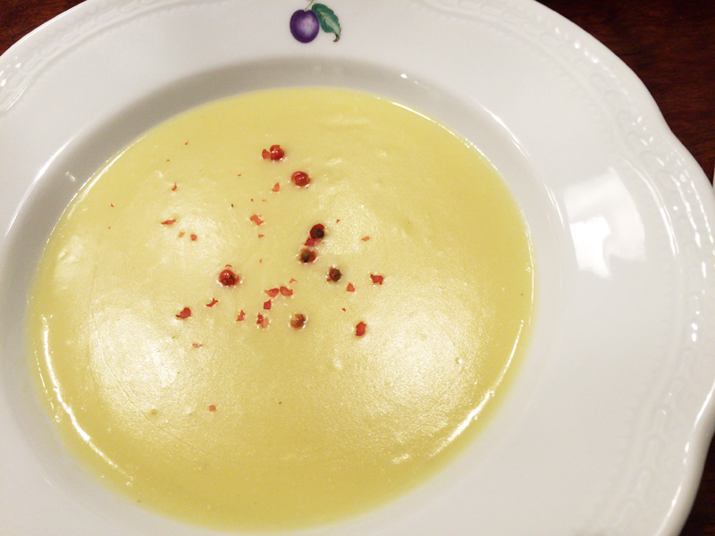 さつまいもはポタージュにしてもおいしい。たまねぎをバターで色がつかない程度に炒めておいたところに、適当な大きさに切ったさつまいもとブイヨンを入れて煮て、その後つぶして裏ごしし、適当な濃度になるよう牛乳を入れ、塩こしょうで調味。さつまいもの澱粉でもったりするので、煮始める前にスライスしたさつまいもを5分程度水に晒してから調理するとよい。赤く散らしてあるのはピンクペッパー。