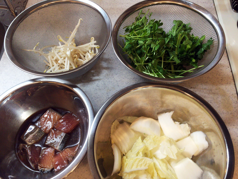 ぶり、白菜、春菊と豆苗、もやしの順に入れて炒め合わせます。