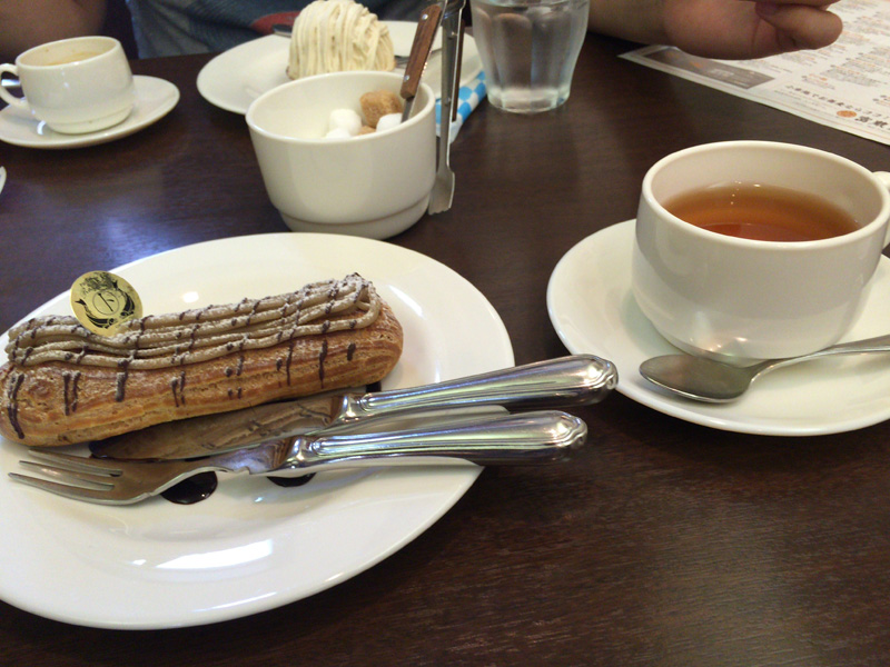 イートインカフェスペースがあって食べられる。ここはパリにこだわった感じの本格的な所で、味も洗練されていた。俺は栗のエクレアを、じょにおはモンブランを選択。