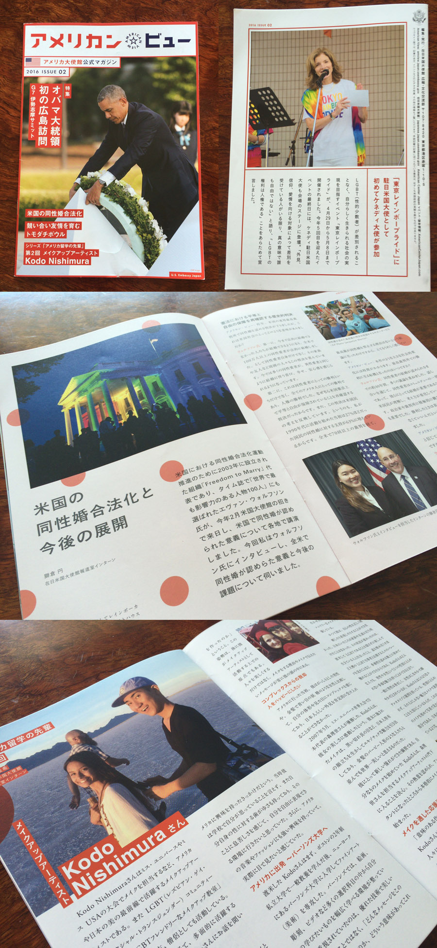 『アメリカン・ビュー』の内容はウェブでも以下リンクから見られる。中の見開き特集が「米国の同性婚合法化と今後の展開」と題する記事(URLがsame-sex-marriageでなくmarriage-equalityとなっていることに注意)。日本人留学のピックアップはLGBT向けメイクアップ講座などをやっている日本人ゲイのメイクアップアーティスト。そして裏表紙は東京レインボープライドに登壇しスピーチしたケネディ駐日米国大使と、LGBT特集といってもいい内容で、アメリカではここまでLGBT施策に国として注目し取り組んでいるのだなと、あらためて認識した。