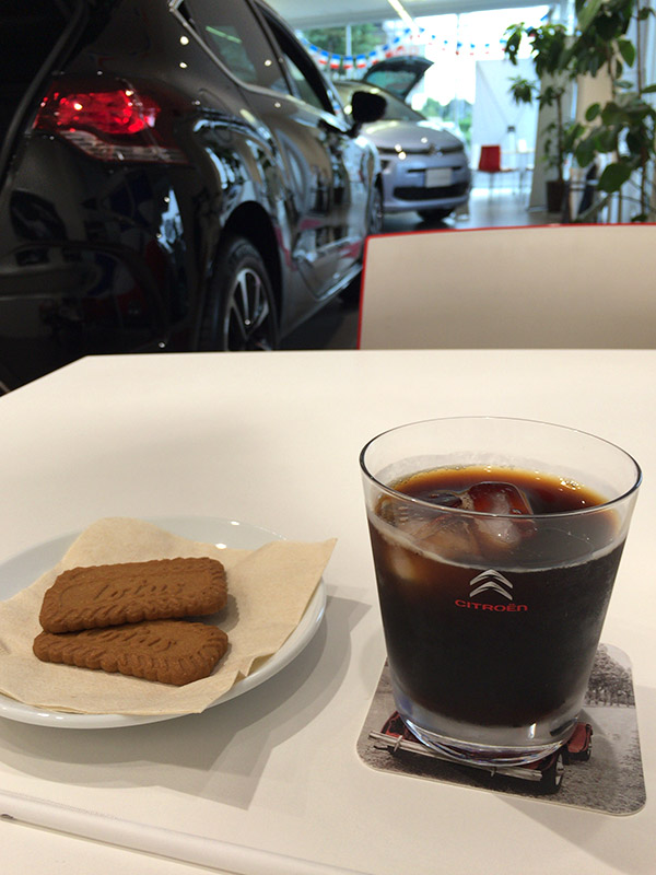 シトロエン車の修理は最寄りのディーラーの場合、近所のプジョーディーラー併設の工場で。預けてシトロエンで待つ間、コーヒーと茶菓子を出してもらう。